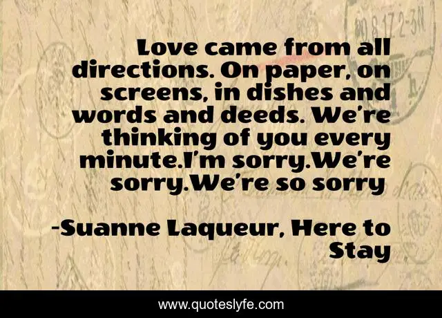 This page presents the quote "Love came from all directions. On paper, on screens, in dishes and words and deeds. We’re thinking of you every minute.I’m sorry.We’re sorry.We’re so sorry…". Author of this quote is Suanne Laqueur, Here to Stay. This quote is about grief, loss, sorrow, love, affection,.