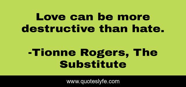 "Tionne Rogers, The Substitute Quotes." Quoteslyfe.com, 2025. Sat. 06 Dec. 2025. <https://www.quoteslyfe.com/quote/Love-can-be-more-destructive-than-hate-178870>.