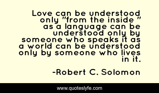 This page presents the quote "Love can be understood only "from the inside " as a language can be understood only by someone who speaks it as a world can be understood only by someone who lives in it.". Author of this quote is Robert C. Solomon. .