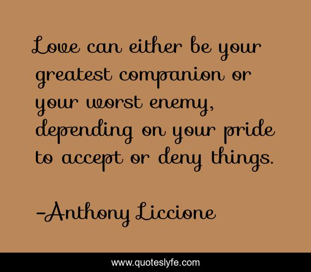 This page presents the quote "Love can either be your greatest companion or your worst enemy, depending on your pride to accept or deny things.". Author of this quote is Anthony Liccione. This quote is about enemy, pride, love, affection, companion,.