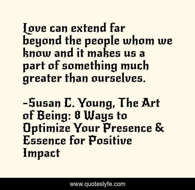 "Susan C. Young, The Art of Being: 8 Ways to Optimize Your Presence & Essence for Positive Impact Quotes." Quoteslyfe.com, 2025. Mon. 08 Dec. 2025. <https://www.quoteslyfe.com/quote/Love-can-extend-far-beyond-the-people-144101>.