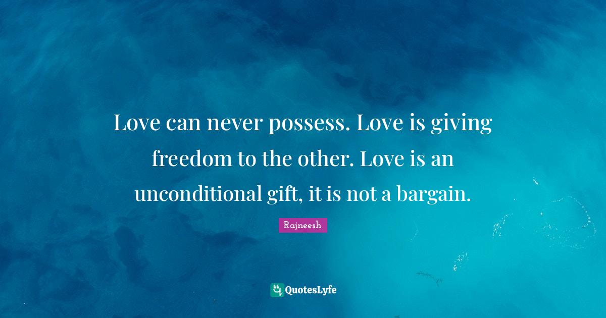 This page presents the quote "Love can never possess. Love is giving freedom to the other. Love is an unconditional gift, it is not a bargain.". Author of this quote is Rajneesh. This quote is about unconditional, affection, inspirational, freedom, love, giving, love is,.