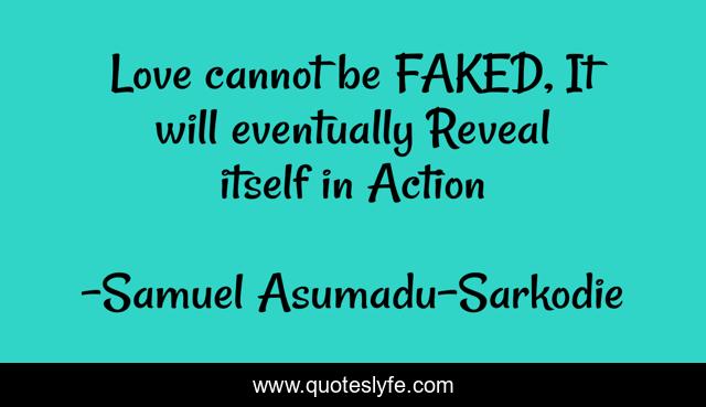 This page presents the quote "Love cannot be FAKED, It will eventually Reveal itself in Action". Author of this quote is Samuel Asumadu-Sarkodie. This quote is about proverbs, words-of-knowledge, discernment, parables, words-of-wisdom, inspirational-life,.