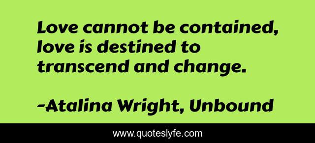 This page presents the quote "Love cannot be contained, love is destined to transcend and change.". Author of this quote is Atalina Wright, Unbound. This quote is about inspirational, love, love-and-saying, affection, enthusiasm,.