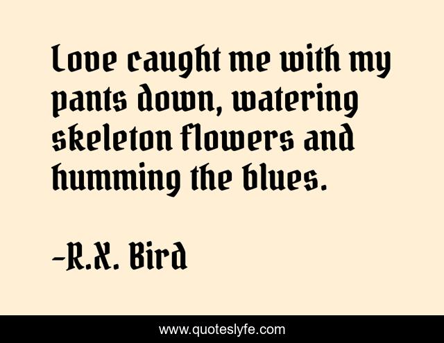 This page presents the quote "Love caught me with my pants down, watering skeleton flowers and humming the blues.". Author of this quote is R.X. Bird. This quote is about dating, love, skeleton, relationship, sad, blues, flowers, affection, pants,.