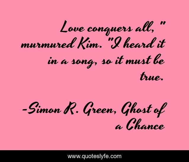 This page presents the quote "Love conquers all, " murmured Kim. "I heard it in a song, so it must be true.". Author of this quote is Simon R. Green, Ghost of a Chance. This quote is about love, song, music, truth, love-conquers-all, true, affection,.