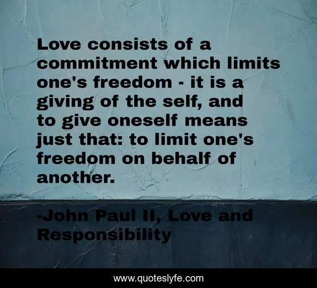 "John Paul II, Love and Responsibility Quotes." Quoteslyfe.com, 2025. Fri. 05 Dec. 2025. <https://www.quoteslyfe.com/quote/Love-consists-of-a-commitment-which-limits-10002>.