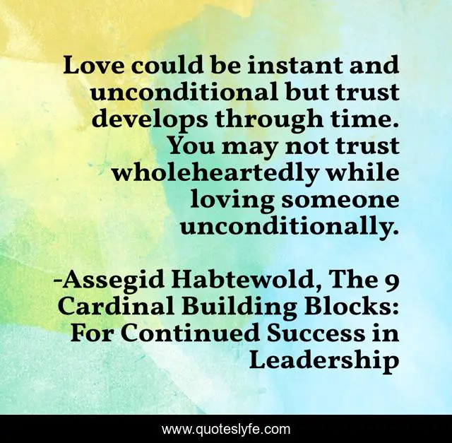 This page presents the quote "Love could be instant and unconditional but trust develops through time. You may not trust wholeheartedly while loving someone unconditionally.". Author of this quote is Assegid Habtewold, The 9 Cardinal Building Blocks: For Continued Success in Leadership. This quote is about trust, love, unconditional-love, affection,.