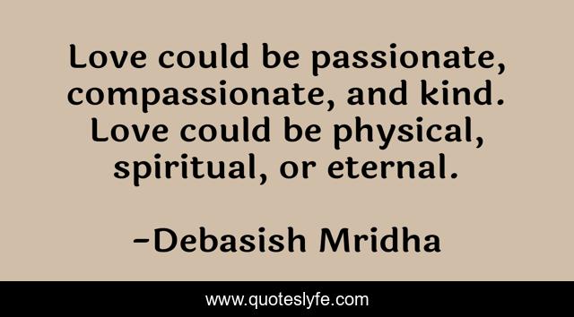 This page presents the quote "Love could be passionate, compassionate, and kind. Love could be physical, spiritual, or eternal.". Author of this quote is Debasish Mridha. This quote is about life, love, knowledge, inspirational, intelligence, philosophy, wisdom, quotes, affection,.