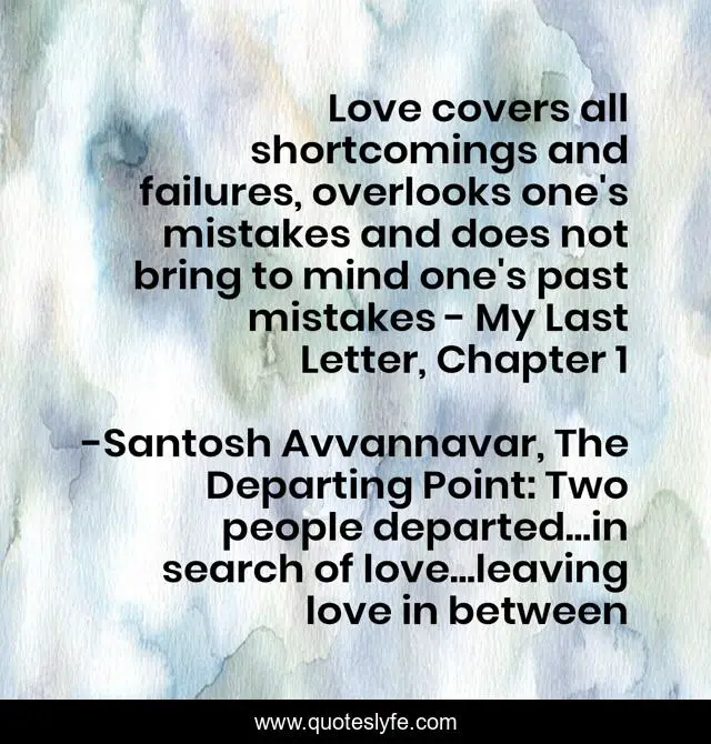 This page presents the quote "Love covers all shortcomings and failures, overlooks one's mistakes and does not bring to mind one's past mistakes - My Last Letter, Chapter 1". Author of this quote is Santosh Avvannavar, The Departing Point: Two people departed...in search of love...leaving love in between. This quote is about letters, departinge, love-story,.