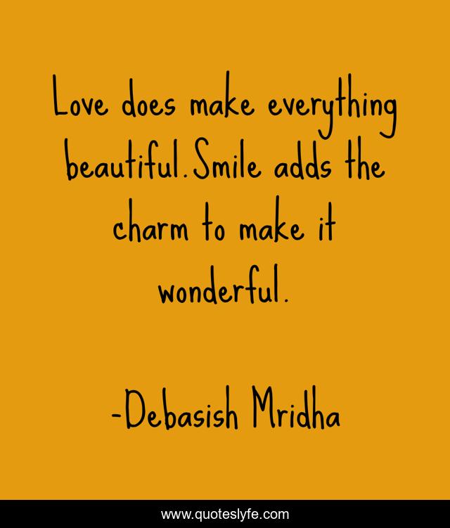 This page presents the quote "Love does make everything beautiful.Smile adds the charm to make it wonderful.". Author of this quote is Debasish Mridha. This quote is about life, love, knowledge, inspirational, intelligence, philosophy, wisdom, quotes, affection,.