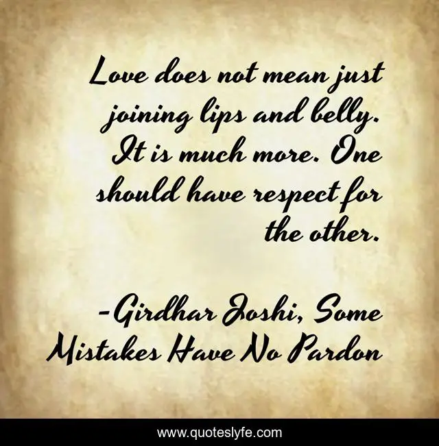 This page presents the quote "Love does not mean just joining lips and belly. It is much more. One should have respect for the other.". Author of this quote is Girdhar Joshi, Some Mistakes Have No Pardon. This quote is about respect, love, affection,.