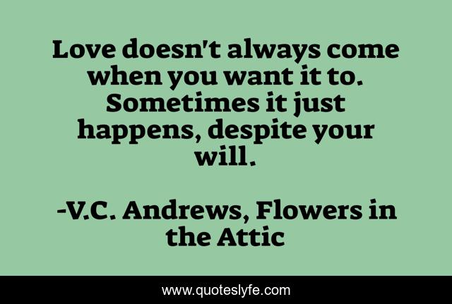 This page presents the quote "Love doesn't always come when you want it to. Sometimes it just happens, despite your will.". Author of this quote is V.C. Andrews, Flowers in the Attic. This quote is about inspirational, love, truth, affection, enthusiasm,.