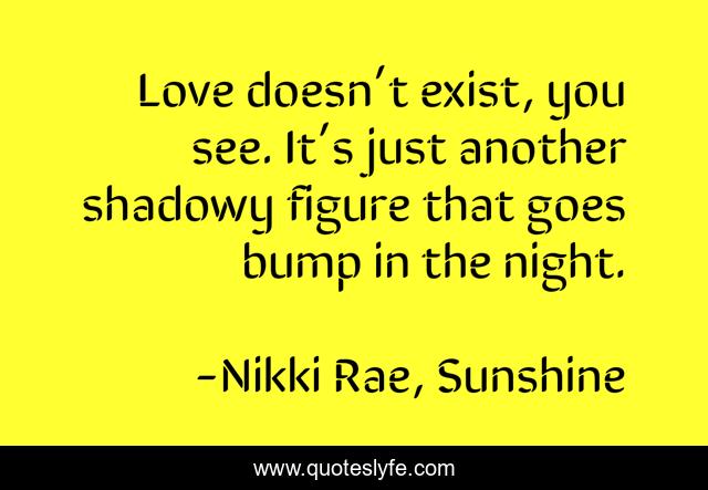 This page presents the quote "Love doesn’t exist, you see. It’s just another shadowy figure that goes bump in the night.". Author of this quote is Nikki Rae, Sunshine. This quote is about love, the-sunshine-series, monsters, new-adult, young-adult, paranormal-romance, affection,.