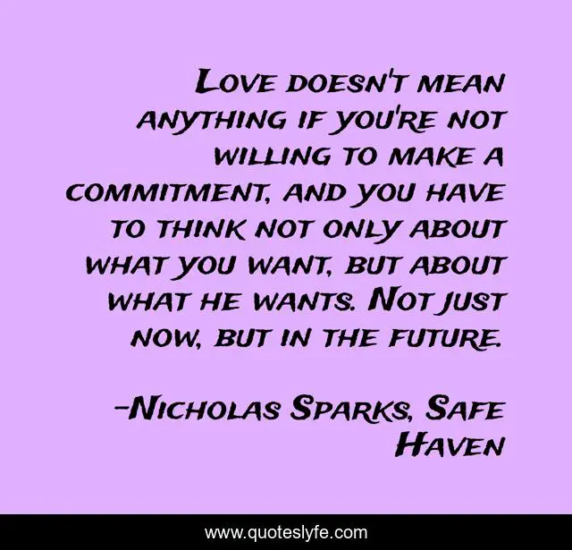 This page presents the quote "Love doesn't mean anything if you're not willing to make a commitment, and you have to think not only about what you want, but about what he wants. Not just now, but in the future.". Author of this quote is Nicholas Sparks, Safe Haven. This quote is about relationships, love, affection,.