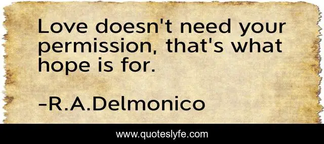This page presents the quote "Love doesn't need your permission, that's what hope is for.". Author of this quote is R.A.Delmonico. This quote is about love, hope, affection,.