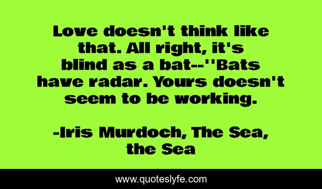This page presents the quote "Love doesn't think like that. All right, it's blind as a bat--''Bats have radar. Yours doesn't seem to be working.". Author of this quote is Iris Murdoch, The Sea, the Sea. This quote is about radar, love-hurts, bats, blindness,.