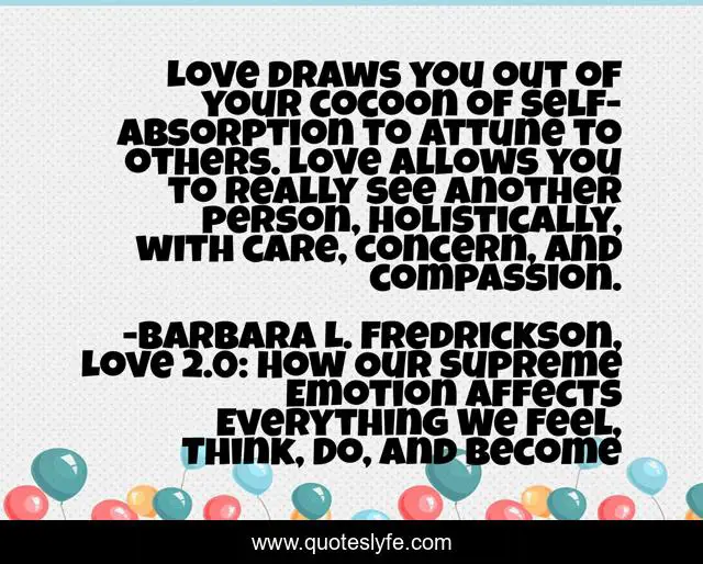 This page presents the quote "Love draws you out of your cocoon of self-absorption to attune to others. Love allows you to really see another person, holistically, with care, concern, and compassion.". Author of this quote is Barbara L. Fredrickson, Love 2.0: How Our Supreme Emotion Affects Everything We Feel, Think, Do, and Become. This quote is about care, love, compassion, seflessness, affection, concern,.