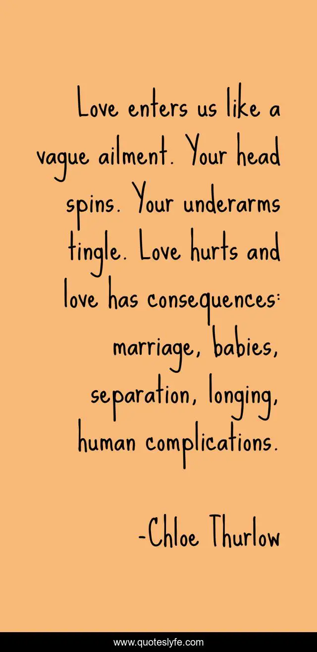 This page presents the quote "Love enters us like a vague ailment. Your head spins. Your underarms tingle. Love hurts and love has consequences: marriage, babies, separation, longing, human complications.". Author of this quote is Chloe Thurlow. This quote is about love, affection, love-hurts,.