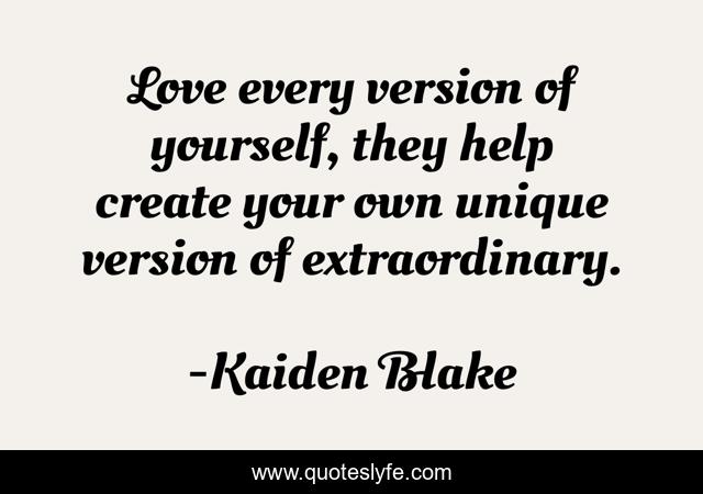 This page presents the quote "Love every version of yourself, they help create your own unique version of extraordinary.". Author of this quote is Kaiden Blake. This quote is about spirituality-of-imperfection, inspirational-attitude, spirituality, inspirational, inspirational-success-failure, inspirational-life, enthusiasm, kaiden-blake,.