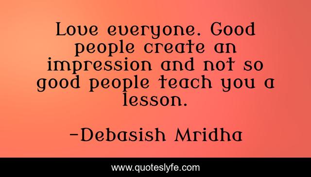 This page presents the quote "Love everyone. Good people create an impression and not so good people teach you a lesson.". Author of this quote is Debasish Mridha. This quote is about philosophy, debasish-mridha, teach-you-a-lesson, quotes, first-impressions, good-people-teach, debasish-mridha-md, inspirational, enthusiasm,.