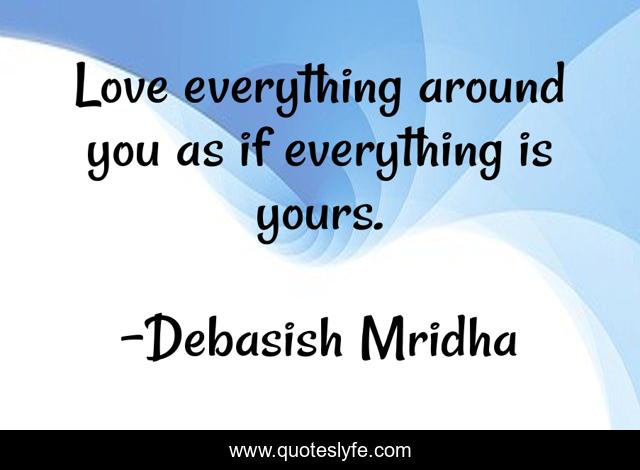 This page presents the quote "Love everything around you as if everything is yours.". Author of this quote is Debasish Mridha. This quote is about life, love, knowledge, inspirational, intelligence, philosophy, wisdom, quotes, affection,.