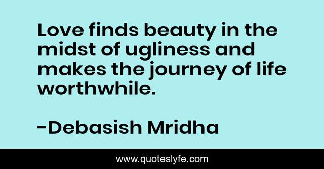 This page presents the quote "Love finds beauty in the midst of ugliness and makes the journey of life worthwhile.". Author of this quote is Debasish Mridha. This quote is about love, quotes, philosophy, debasish-mridha, life-wisdom, love-finds-beauty, journey-of-life, inspirational, enthusiasm,.