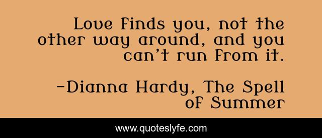 This page presents the quote "Love finds you, not the other way around, and you can’t run from it.". Author of this quote is Dianna Hardy, The Spell of Summer. This quote is about running-from-love, love, running, fear, affection, loving,.