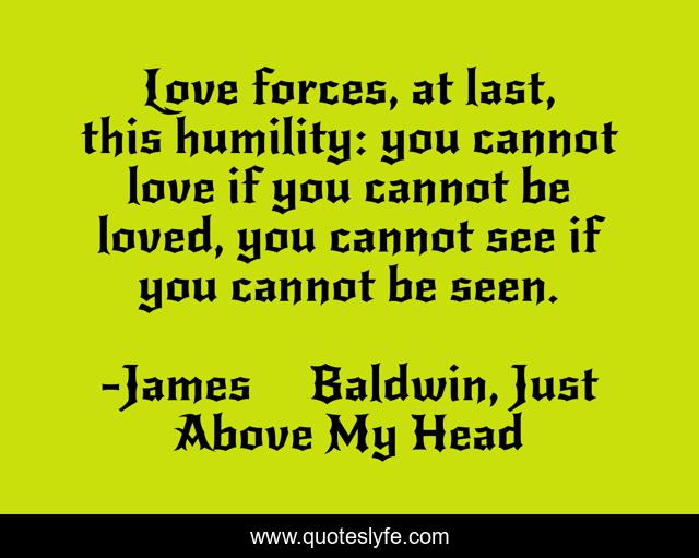 This page presents the quote "Love forces, at last, this humility: you cannot love if you cannot be loved, you cannot see if you cannot be seen.". Author of this quote is James Baldwin, Just Above My Head. This quote is about love, affection,.