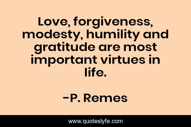 This page presents the quote "Love, forgiveness, modesty, humility and gratitude are most important virtues in life.". Author of this quote is P. Remes. This quote is about gratitude, modesty, love, humility, forgiveness, affection,.