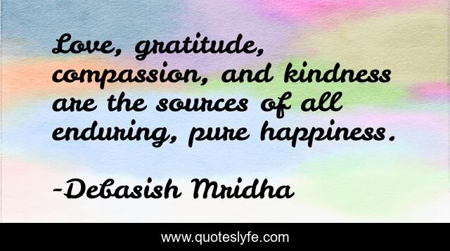 This page presents the quote "Love, gratitude, compassion, and kindness are the sources of all enduring, pure happiness.". Author of this quote is Debasish Mridha. This quote is about gratitude, life, education, love, inspirational, compassion, intelligence, philosophy, truth,.