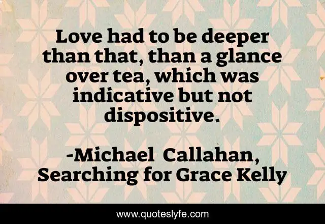 This page presents the quote "Love had to be deeper than that, than a glance over tea, which was indicative but not dispositive.". Author of this quote is Michael Callahan, Searching for Grace Kelly. This quote is about love, meaning, thoughts-about-love, language, affection,.
