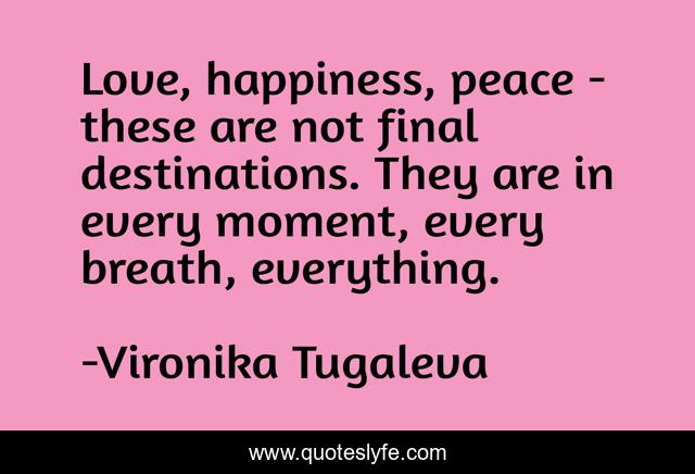 This page presents the quote "Love, happiness, peace - these are not final destinations. They are in every moment, every breath, everything.". Author of this quote is Vironika Tugaleva. This quote is about peace, love, destination, journey, happiness, truth, affection,.