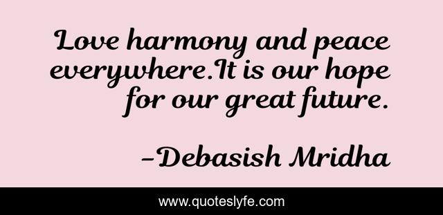 This page presents the quote "Love harmony and peace everywhere.It is our hope for our great future.". Author of this quote is Debasish Mridha. This quote is about life, love, knowledge, inspirational, intelligence, philosophy, wisdom, quotes, affection,.