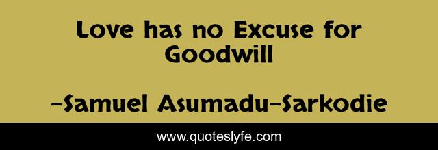 This page presents the quote "Love has no Excuse for Goodwill". Author of this quote is Samuel Asumadu-Sarkodie. This quote is about proverbs, words-of-knowledge, discernment, parables, words-of-wisdom, inspiration,.