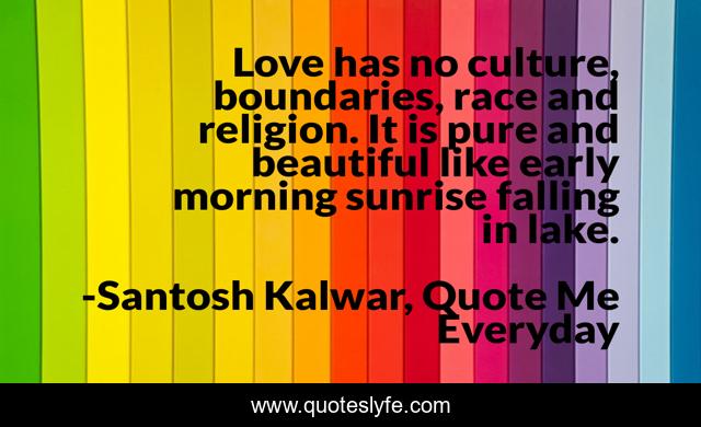 This page presents the quote "Love has no culture, boundaries, race and religion. It is pure and beautiful like early morning sunrise falling in lake.". Author of this quote is Santosh Kalwar, Quote Me Everyday. .
