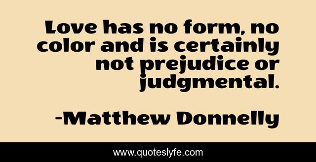 This page presents the quote "Love has no form, no color and is certainly not prejudice or judgmental.". Author of this quote is Matthew Donnelly. This quote is about love, no-prejudice, no-form, not-judgmental, no-color, affection,.