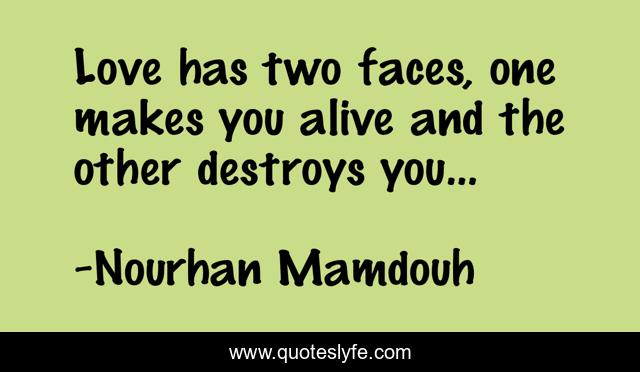 This page presents the quote "Love has two faces, one makes you alive and the other destroys you...". Author of this quote is Nourhan Mamdouh. .