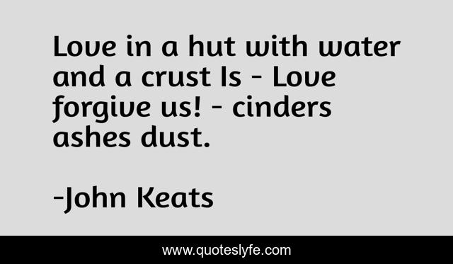This page presents the quote "Love in a hut with water and a crust Is - Love forgive us! - cinders ashes dust.". Author of this quote is John Keats. This quote is about love, affection,.