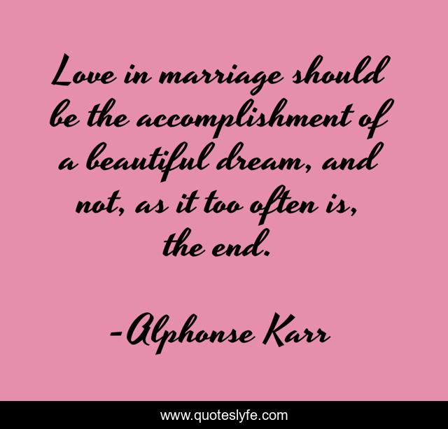This page presents the quote "Love in marriage should be the accomplishment of a beautiful dream, and not, as it too often is, the end.". Author of this quote is Alphonse Karr. This quote is about beautiful, love, end, affection,.