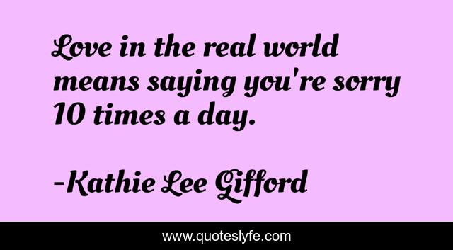 This page presents the quote "Love in the real world means saying you're sorry 10 times a day.". Author of this quote is Kathie Lee Gifford. This quote is about world, forgiveness, day,.