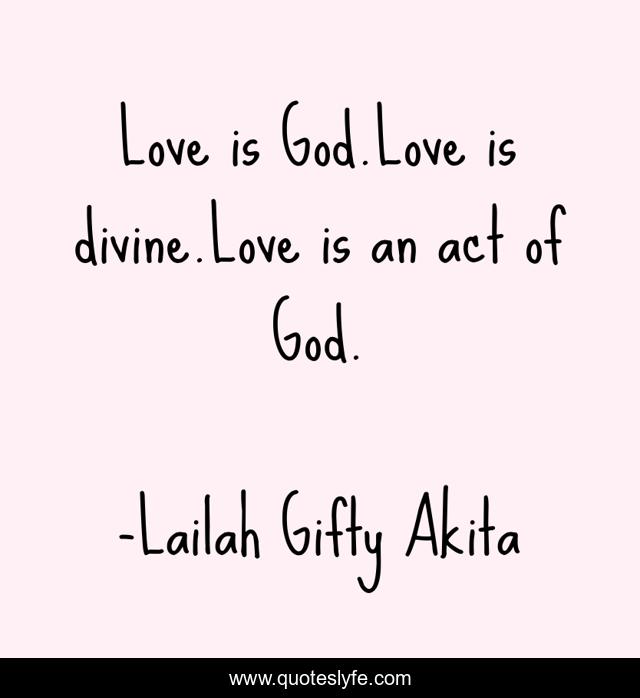 This page presents the quote "Love is God.Love is divine.Love is an act of God.". Author of this quote is Lailah Gifty Akita. This quote is about lovely-things, life, divine-self, love, lovely-words, divine-love, love-at-first-sight, lovely-way-with-words, divine-grace,.