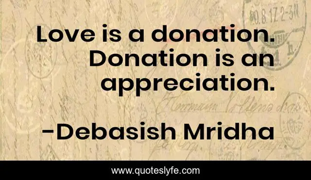 This page presents the quote "Love is a donation. Donation is an appreciation.". Author of this quote is Debasish Mridha. This quote is about life, love, knowledge, inspirational, intelligence, philosophy, wisdom, quotes, affection,.