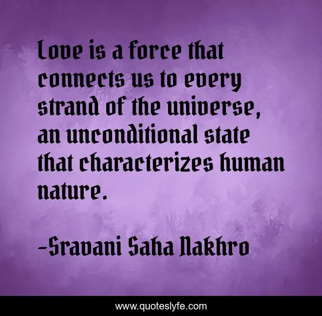 This page presents the quote "Love is a force that connects us to every strand of the universe, an unconditional state that characterizes human nature.". Author of this quote is Sravani Saha Nakhro. .