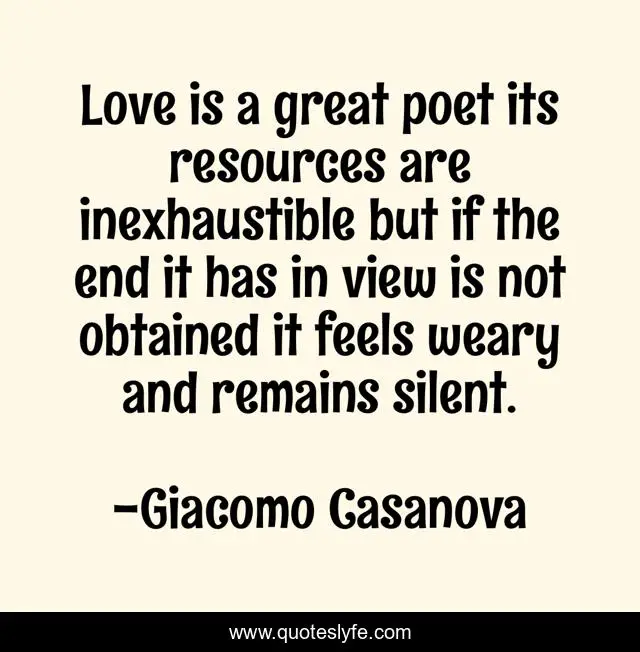 This page presents the quote "Love is a great poet its resources are inexhaustible but if the end it has in view is not obtained it feels weary and remains silent.". Author of this quote is Giacomo Casanova. .