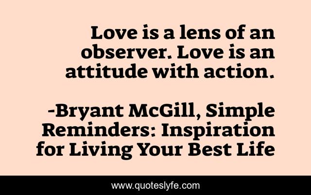 This page presents the quote "Love is a lens of an observer. Love is an attitude with action.". Author of this quote is Bryant McGill, Simple Reminders: Inspiration for Living Your Best Life. This quote is about love, observation, wisdom, behaviour, attitude, action, affection,.
