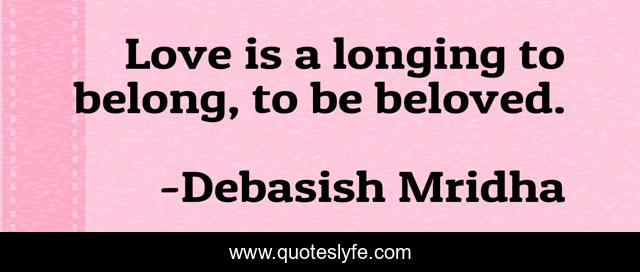 This page presents the quote "Love is a longing to belong, to be beloved.". Author of this quote is Debasish Mridha. This quote is about life, love, knowledge, inspirational, intelligence, philosophy, wisdom, quotes, affection,.