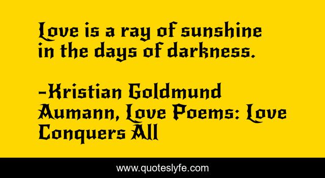 This page presents the quote "Love is a ray of sunshine in the days of darkness.". Author of this quote is Kristian Goldmund Aumann, Love Poems: Love Conquers All. This quote is about love, affection,.