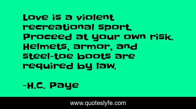 This page presents the quote "Love is a violent recreational sport. Proceed at your own risk. Helmets, armor, and steel-toe boots are required by law.". Author of this quote is H.C. Paye. This quote is about broken-heart, helmets, love, risk, armor, violence, sports, safety, law,.