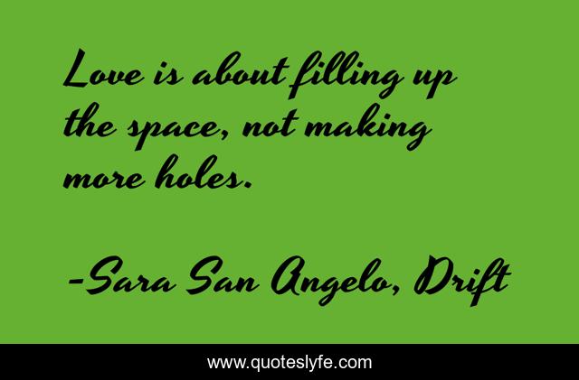This page presents the quote "Love is about filling up the space, not making more holes.". Author of this quote is Sara San Angelo, Drift. This quote is about relationships, love, inspirational, enthusiasm, affection, insightful,.